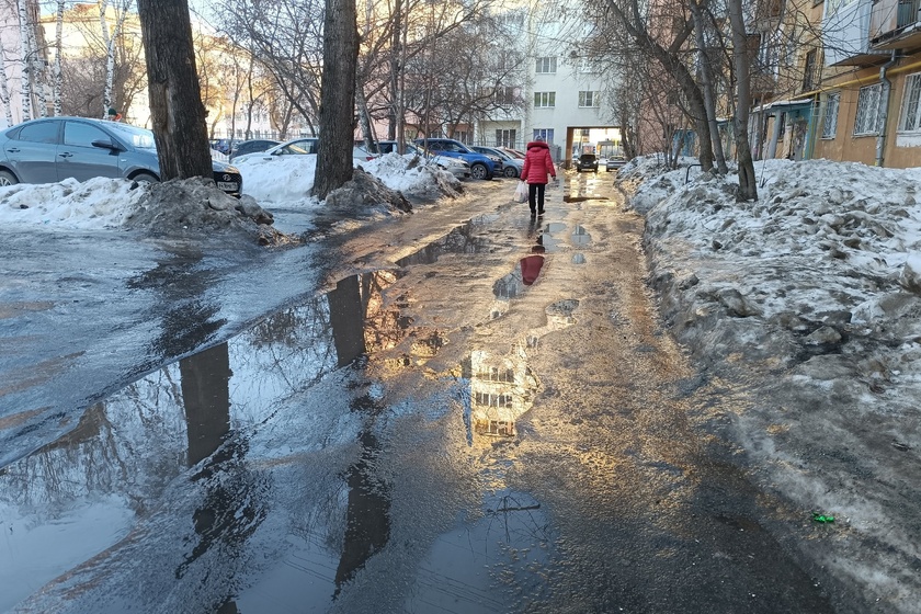 В Екатеринбурге продолжаются погодные качели. Жители города жалуются на грязевые "моря", затопившие дворовые территории. Даже в центре города, вокруг Плотинки, невозможно пройти, не вымазавшись в грязи.