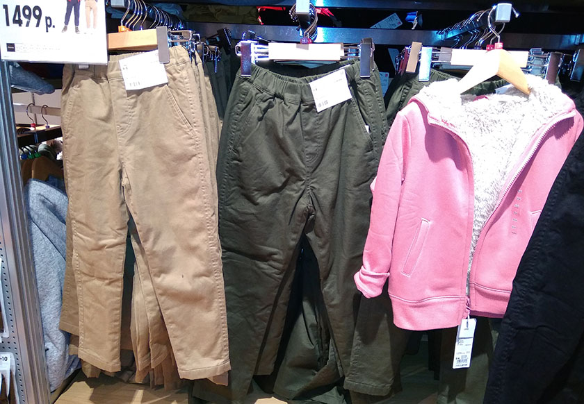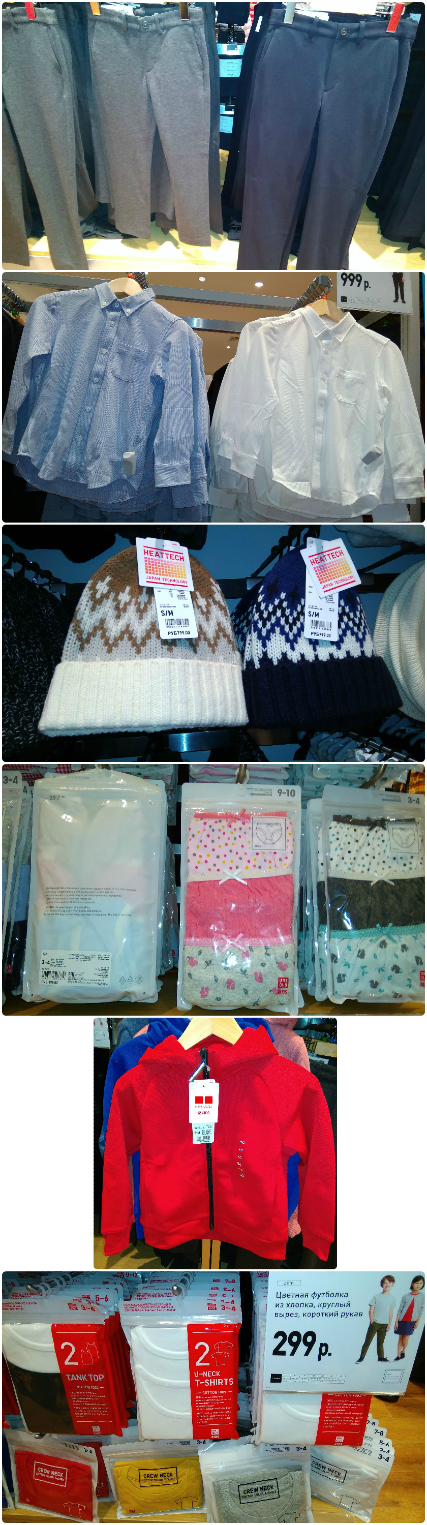 Отделы для взрослых, размеры от 42. Публикуем фото под флагом подростковой моды – большинство подростков укладываются в размер от 42 уже с 12 лет. Трусы женские – от 399 руб. за штуку, мужские боксёры – от 499 руб. «Юникло» это носочно-бельевой рай! Вы посмотрите, какой выбор. Это как «Икея» носков и трусов, только готовых. Мужские носки – 249 руб. за пару, 799 руб. за 4 пары. Пуховики от 2999 руб. – это специальные цены до конца месяца. Брюки-чиносы – 2999 руб. Сорочки – 2999 руб. Шапки женские «единый размер» - 999 руб., шапки из кашемира – 2999 руб. Перчатки из кашемира – 1999 руб., шарфы – 3999 руб. Леггинсы – 1499 руб., тёплые – 1999 руб. Водолазки из шерсти – 1999 руб. Кофты из мериноса – от 1999 руб., специальная цена до конца месяца. Толстовки с мехом – 2999 руб. Рубашки женские из вискозы – 1499 руб. Футболки мужские – 499 руб. Пуховик длинный – 9999 руб. Флиски – 1999 руб. Джинсы мужские – от 1999 руб. Женские офисные брюки - 1999 руб.