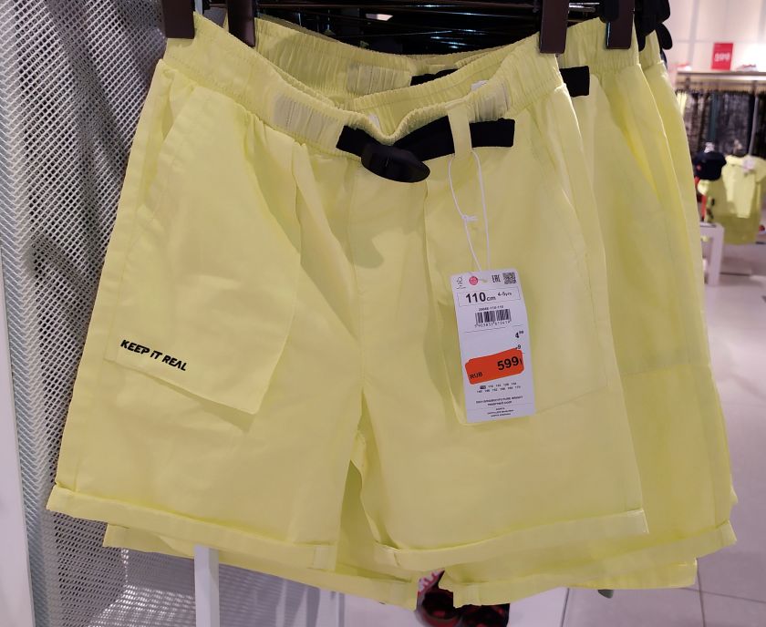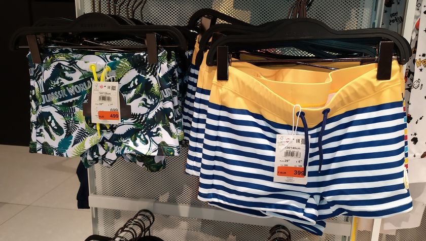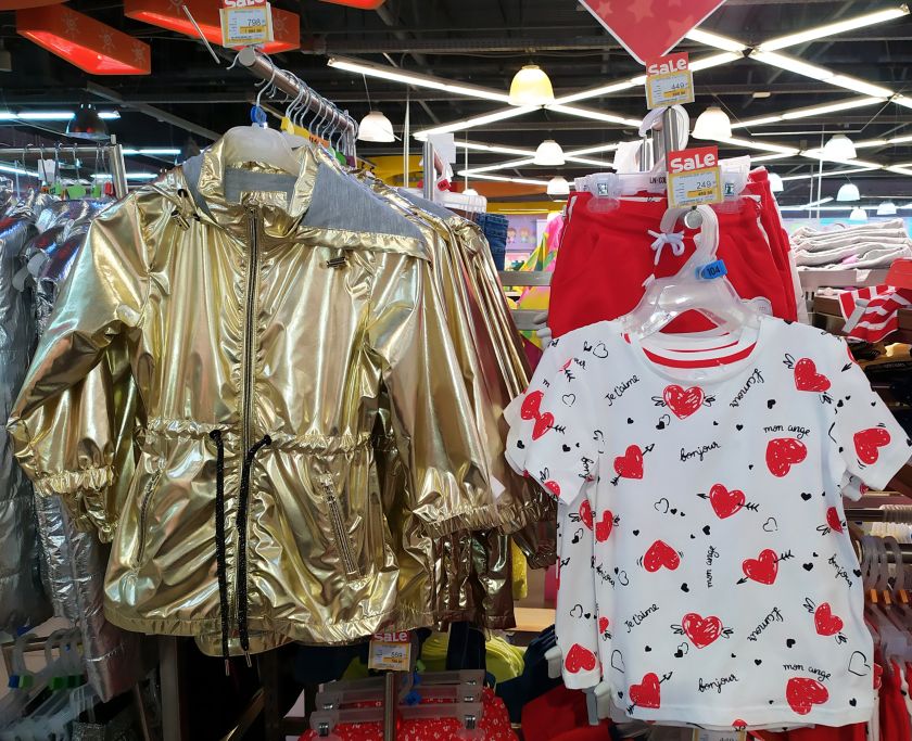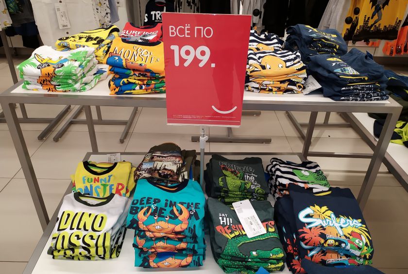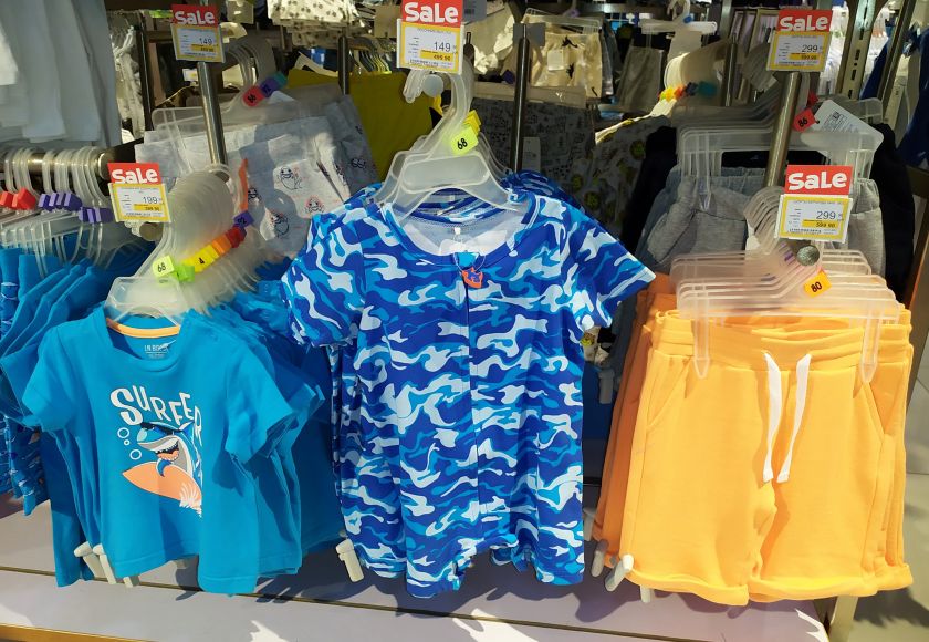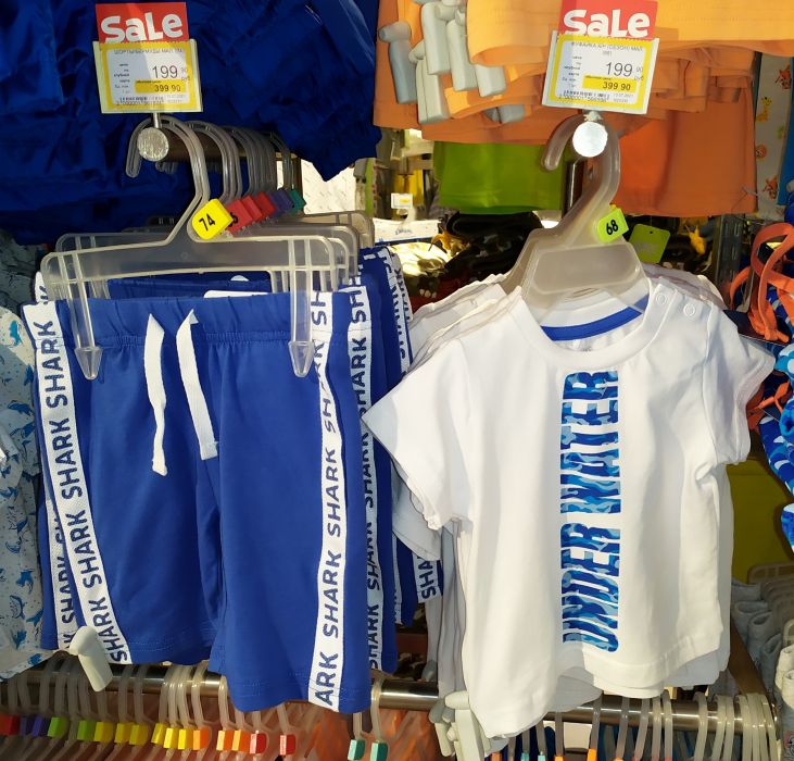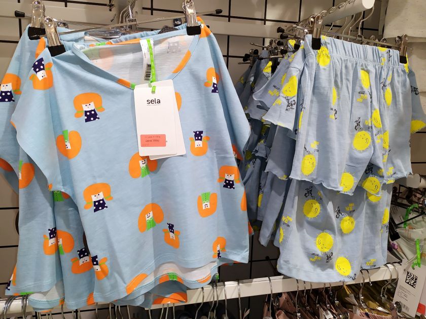 SELA разграблена, в женском отделе осталось то, что подороже, и размеров нет. Тренировочные штаны – 799 руб., их много. В детском отделе ещё достаточно одежды со скидками. Джинсовые шорты – 599 руб., 6-7 лет. Брюки (или бриджи) – 499 руб., 4-7 лет. Пижамы с шортами – 399 руб., дошкольные. Рубашки для мальчиков – 499 руб., 8-11 лет.