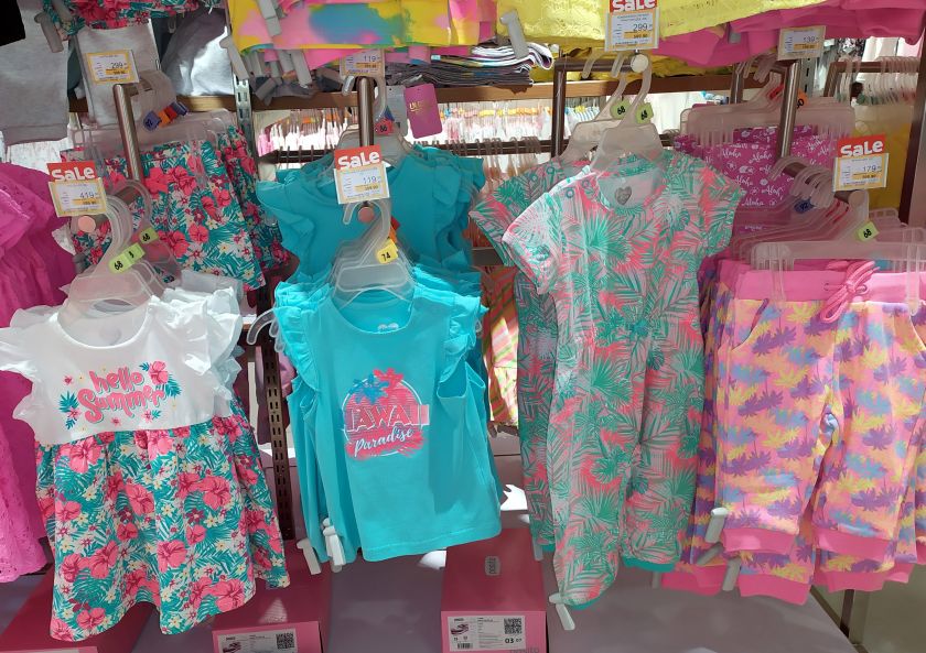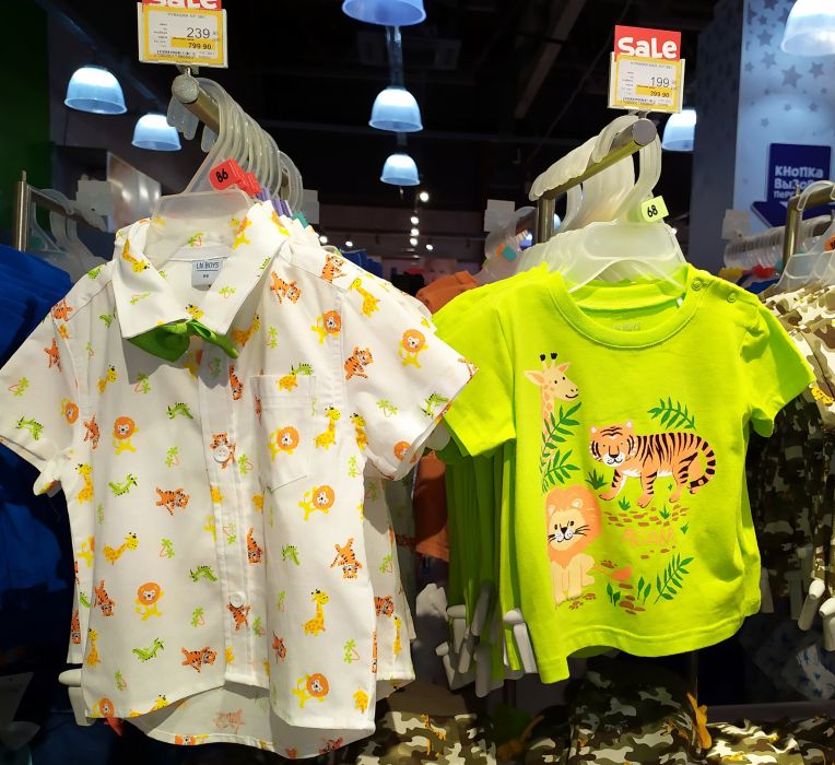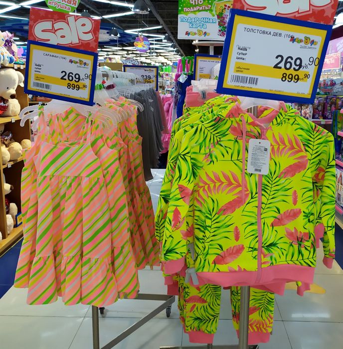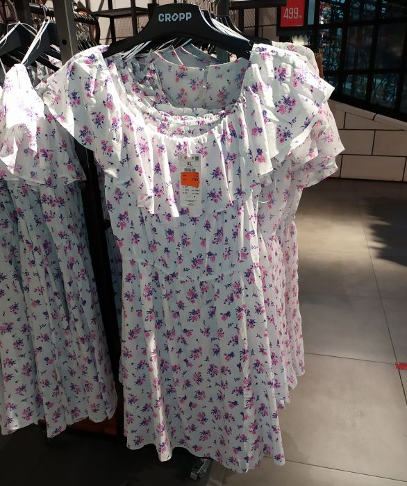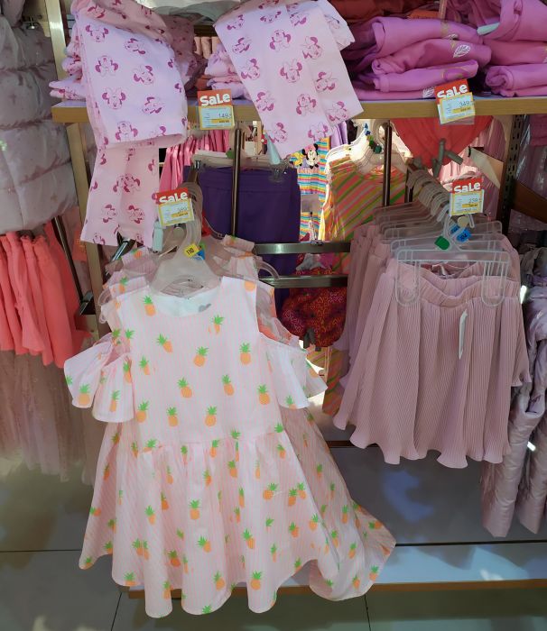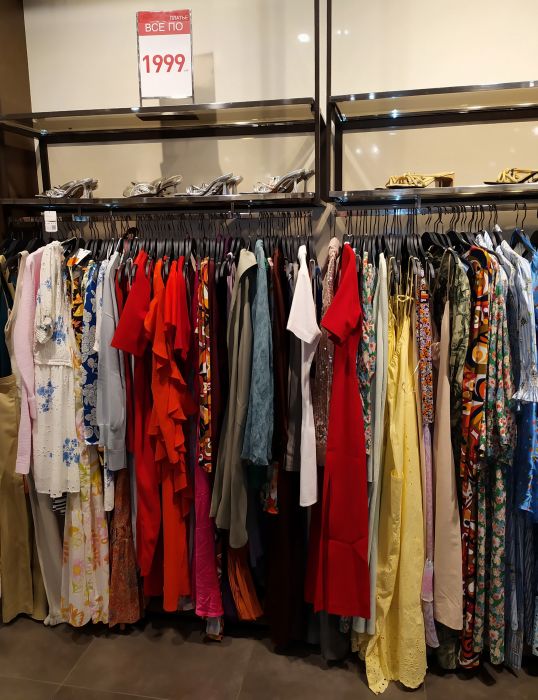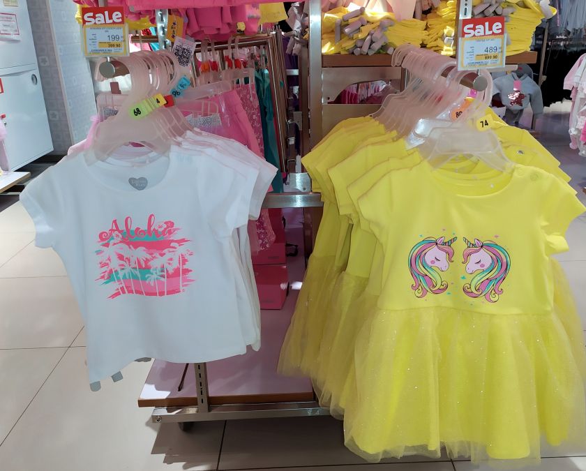 В отделах для мальчиков, мужчин и лялек смотреть не на что, у девочек что-то древнее висит: платья с цветами подростковые – 850 руб., короткие футболки на XS – 200 руб., женские рубашки – 700 руб., блузки – 250 руб., оранжевая рубашка-платье – 1500 руб.