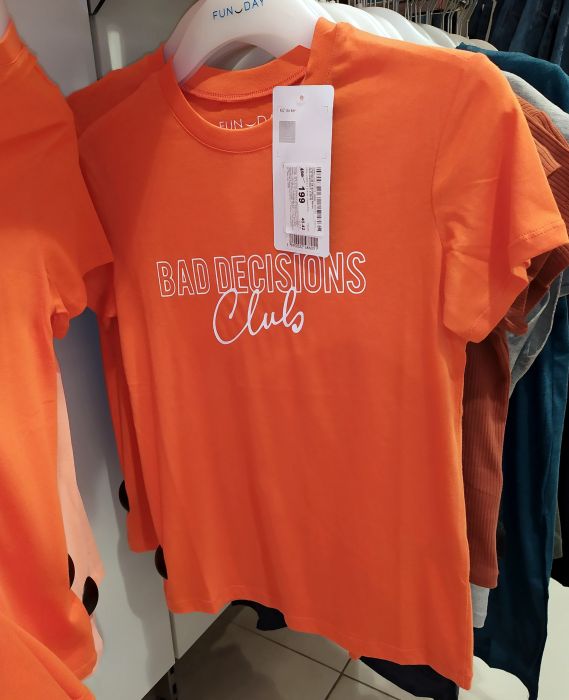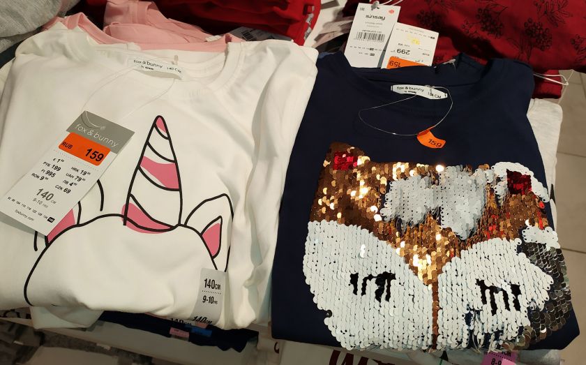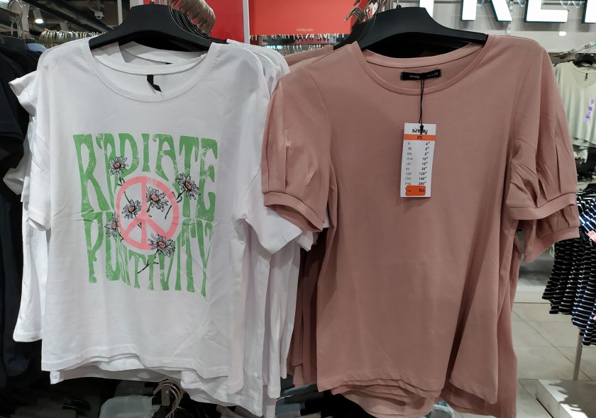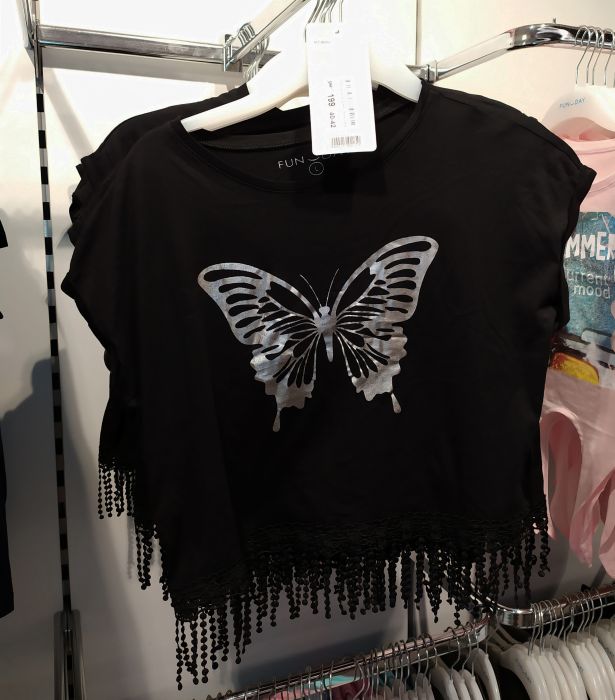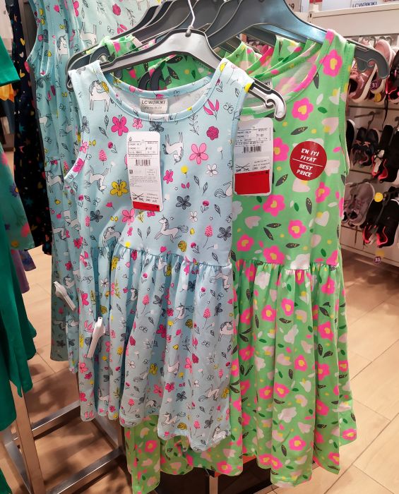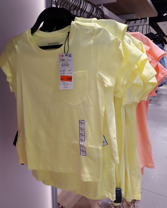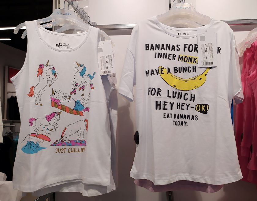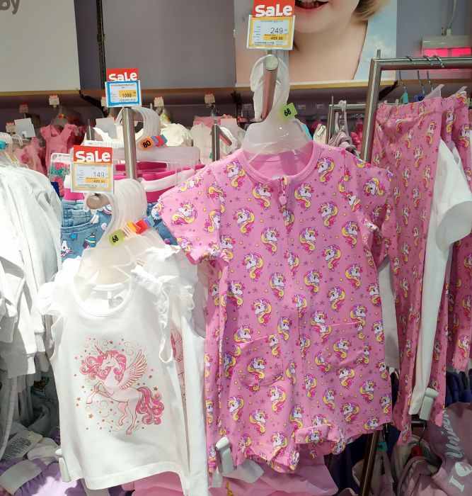 В отделах для мальчиков, мужчин и лялек смотреть не на что, у девочек что-то древнее висит: платья с цветами подростковые – 850 руб., короткие футболки на XS – 200 руб., женские рубашки – 700 руб., блузки – 250 руб., оранжевая рубашка-платье – 1500 руб.