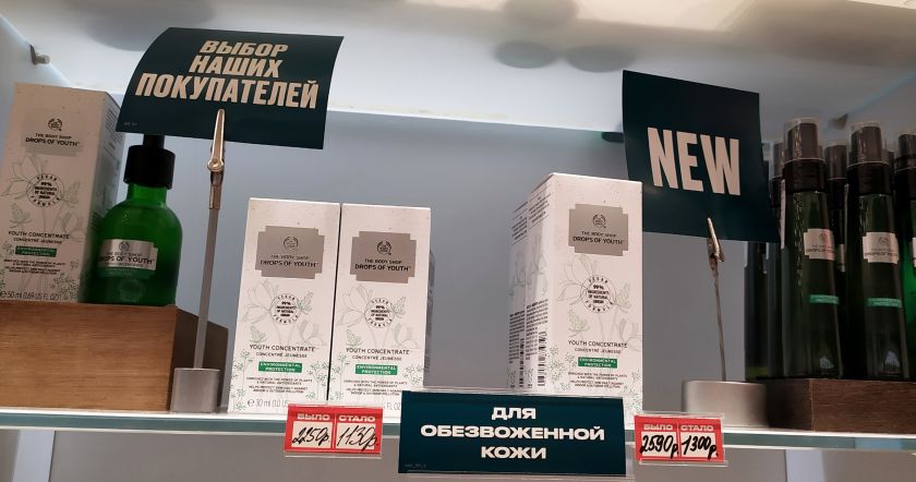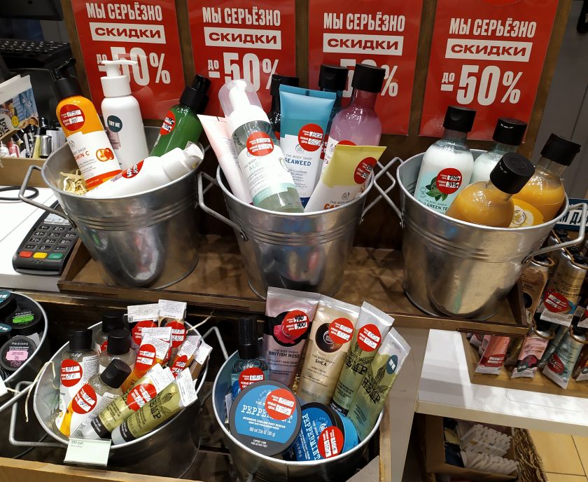 Толпа женщин штурмует THE BODY SHOP – скидки 50%. Фото сделать не удалось толком из-за ажиотажа.