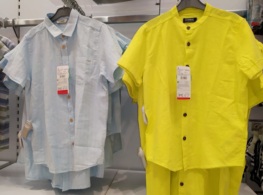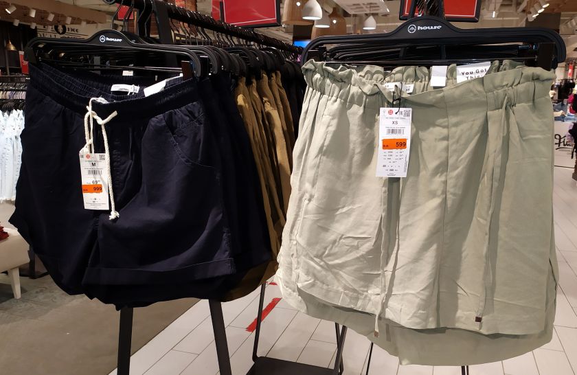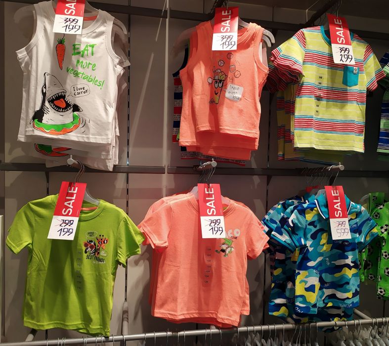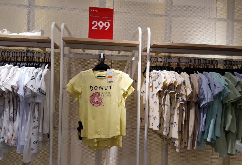 Детские футболки – 799 руб., шорты – 1799 руб., школьные брюки 10-14 лет – 1399 руб. Мужские летние брюки – 2499 руб., джемперы ~2200 руб., женские кардиганы ~3300 руб., платье – 3800 руб., шорты – 2999 руб., блузки – 2150 руб., женские футболки 1000-1600 руб.