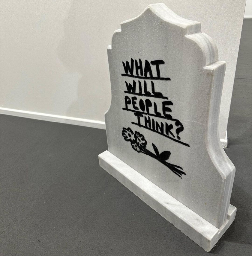 Она напугала фолловеров снимком могильной плиты, но оказалось, что это тоже выставочный экспонат с надписью «Что подумают люди?».