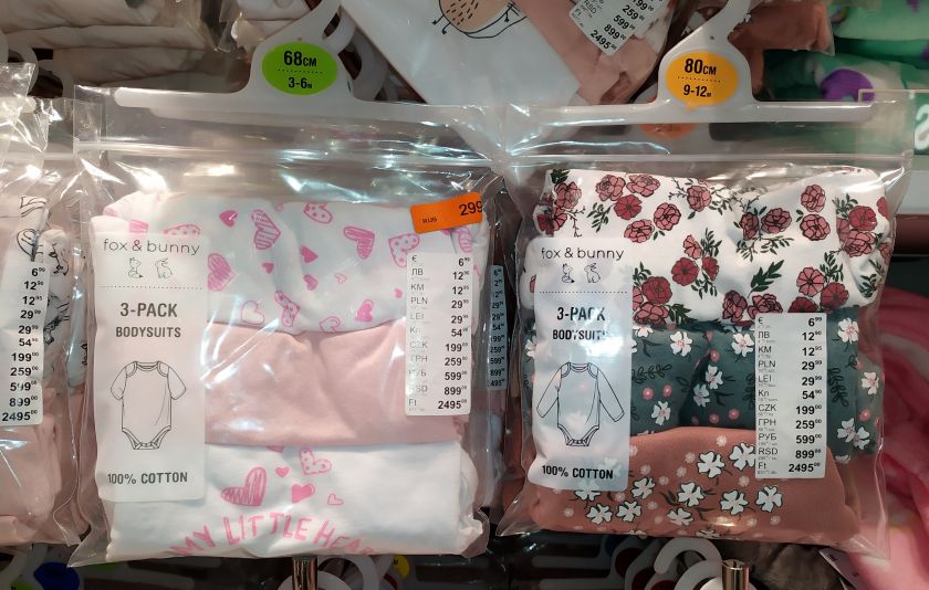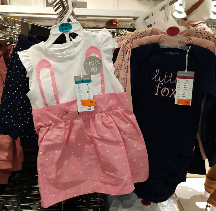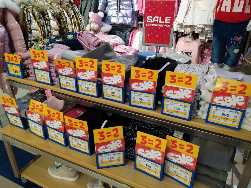 Детские размеры 0-2 и 2-10 лет (в «Веер Молле» есть подростковые отделы). В мужском отделе скидок мало, скоро будет больше.