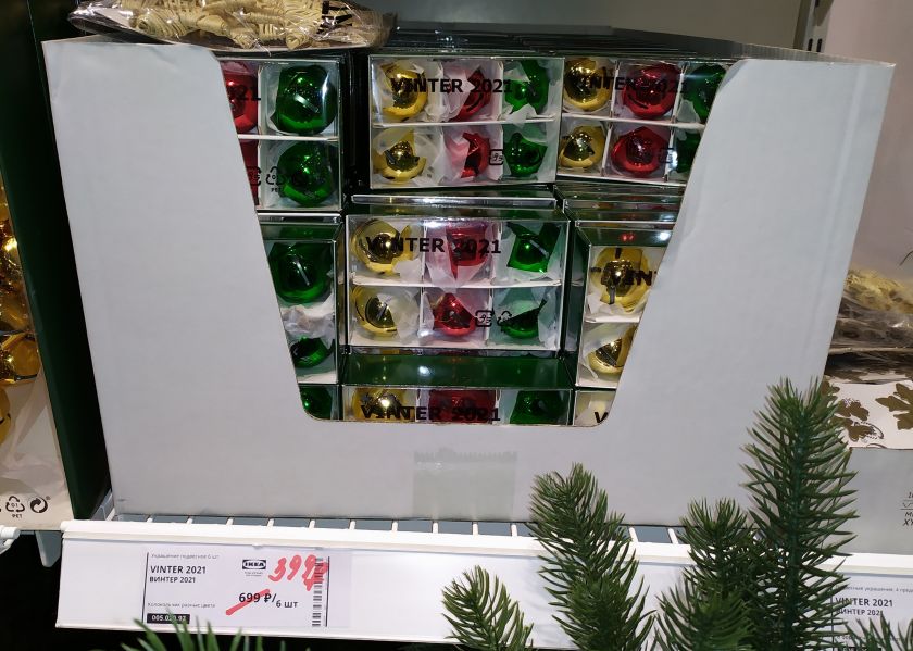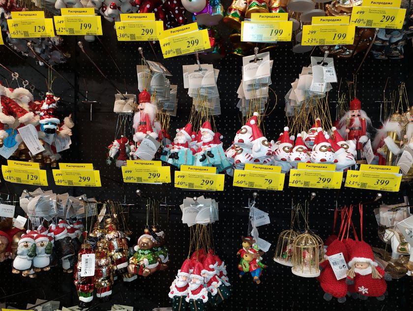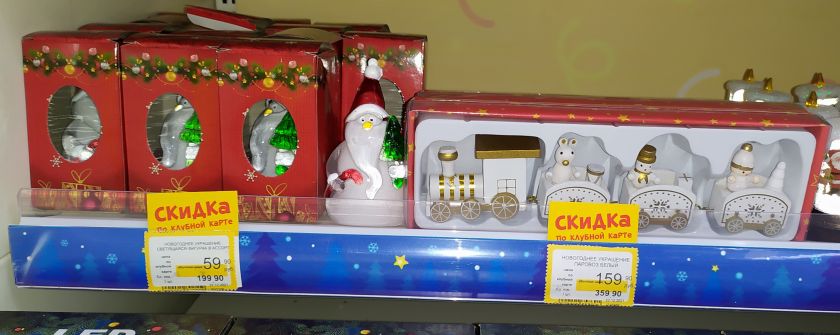 В ОБИ почти нет скидок в его грандиозном новогоднем отделе, занявшем половину «Садоводства». За 40 рублей распродают контейнеры с пингвином.