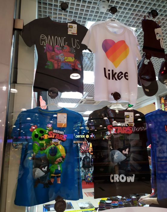 В магазинчике ИГРОВОЙ МИР видны футболки с амонгасами и Brawl Stars, цена 799 руб.